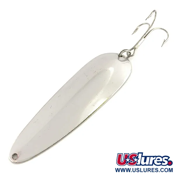Mit einem Gewicht von beachtlichen 28 g (1 oz) ist dieser klassische Blinker ein echtes Arbeitstier aus den Eppinger-Werkstätten. Das helle Nickel-Finish reflektiert das Licht brillant und unterstreicht die hochwertige Beschichtung, die diese in Detroit geborenen Köder legendär gemacht hat. Auf der konkaven Unterseite finden Sie die scharfe "DARDEVLE"-Prägung sowie die Markierung "DETROIT. U.S.A.", die seine Herkunft in der Ära vor dem Umzug des Unternehmens nach Dearborn im Jahr 1959 verankert. Mit einer Länge von 9 cm (3 1/2") verfügt dieses Exemplar, identifiziert durch den Produktcode 9164, über das ikonische Tropfenprofil, das für eine ausgeprägte Taumelbewegung beim langsamen Einholen gedacht ist. Die Hardware ist bemerkenswert robust, mit einem stabilen Drillingshaken, der durch einen hochbelastbaren Sprengring am breiteren Schwanz gesichert ist. Dieser spezifische Köder befindet sich in einem 5/5-Zustand und behält eine spiegelglatte Oberfläche über seinen gesamten Metallkörper bei. Diese Löffel repräsentieren über ein Jahrhundert amerikanischer Handwerkskunst unter Verwendung der proprietären Matrizen, mit denen Lou Eppinger bekanntlich Werkzeuge schuf, die so effektiv waren, dass sie einst in Überlebenssets für die Luftfahrt enthalten waren.