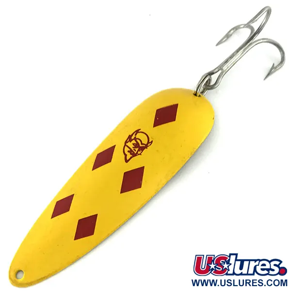 In die messingfarbene Rückseite ist das Gewicht von 1oz (28g) deutlich eingeprägt, was diesen klassischen Casting-Blinker stabilisiert. Dieses Exemplar von Eppinger mit dem Artikelcode 9501 zeigt das legendäre Five of Diamonds-Muster – eine leuchtend gelbe Emaille-Lackierung, verziert mit fünf tiefroten Rauten und dem unverwechselbaren Teufelskopf-Logo in der Mitte. Mit einer Länge von 9 cm (3 1/2") ist die Oberfläche des Blinkers außergewöhnlich sauber und verdient eine 5/5 Zustandsbewertung für das gut erhaltene Finish und die scharfen Prägungen. Die Rückseite ist tief mit 'DARDEVLE' und 'EPPINGER' markiert, was die Präzision der firmeneigenen Matrizen aus dem Werk in Dearborn, Michigan, unterstreicht. Die Hardware ist ebenso robust und verfügt über einen stabilen, silberfarbenen Drilling, der scharf und oxidationsfrei bleibt. Ob beim Werfen oder Schleppen, die konkave Form ist für ein langsames Einholen konzipiert, das eine schwere taumelnde Bewegung im Wasser erzeugt. Dieses spezifische Farbschema ist seit langem die Wahl der Angler für klare Wasserverhältnisse, wo das helle Gelb und die nickelgelbe Rückseite für hohe Sichtbarkeit sorgen.