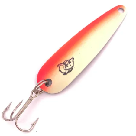 Dieser Vintage-Blinker hat eine Länge von genau 6,5 cm (2 1/2") und stammt aus der frühen Produktionsära von Eppinger in Detroit. Mit einem Gewicht von 5 g (3/16 oz) besticht der Chuck-Lett 3400 UV durch einen lebhaften Farbverlauf von fluoreszierendem Orange, das in einen cremefarbenen Körper übergeht. Auf der Vorderseite befindet sich das legendäre Teufelskopf-Logo, ein Symbol der Dardevle-Tradition, die bis ins Jahr 1906 in Lou Eppingers Kellerwerkstatt zurückreicht. Die Rückseite ist eine polierte silberfarbene Platte, die deutlich mit „CHUCK-LETT DETROIT U.S.A. 3400“ gestempelt ist, was die regionale Herkunft vor dem Umzug des Unternehmens nach Dearborn im Jahr 1959 bestätigt. Dieses spezielle Exemplar mit der Artikelnummer 3938 ist unbenutzt und hat seinen ursprünglichen Glanz sowie den scharfen Drilling bewahrt. Während viele Dardevles wegen ihrer Zuverlässigkeit berühmterweise in Überlebenskits für die Luftfahrt enthalten waren, wurde dieses Modell speziell für das Schleppfischen entwickelt. Die konkave, längliche Form sorgt für eine markante Wasserverdrängung bei gleichmäßigem Einholen.