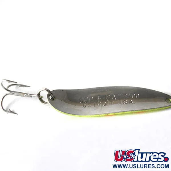Mit einem Gewicht von 1/2 oz (14 g) präsentiert sich dieser Eppinger Dardevle Cop-E-Cat im kultigen Fünf-Diamanten-Muster in Rot auf einem leuchtend fluoreszierenden grünen Körper. Mit einer Länge von 2 1/2" (6,5 cm) trägt dieser Löffelblinker das unverkennbare „Devil“-Logo in der Mitte – ein Markenzeichen des Erbes von Lou Eppinger, das 1906 in Detroit begann. Die Ausstattung besteht aus einem stabilen Sprengring, der einen scharfen Drillingshaken hält, ideal für klassische Wurf- oder Schlepptechniken. Das Finish dieses speziellen Modells mit dem Produktcode 0165 ist glänzend und bietet eine hohe Sichtbarkeit unter verschiedenen Wasserbedingungen. Die konkave Oberfläche ist für eine ausgeprägte wobbelnde Aktion bei gleichmäßigem Einholen konzipiert. Hergestellt in den USA mit proprietären Matrizen, weist der Metallkörper altersbedingte geringfügige kosmetische Gebrauchsspuren auf, was eine Zustandsbewertung von 4/5 ergibt.