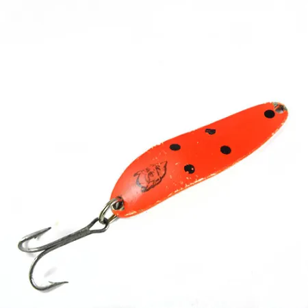 Die orangefarbene Lackierung mit schwarzen Punkten und dem klassischen Teufelskopf-Logo macht diesen 10 g (1/3 oz) Blinker zu einem Highlight für jede Vintage-Sammlung. Mit einer Länge von 5,5 cm (2 1/4") verfügt der Cop-E-Cat über einen konkaven Metallkörper mit der Prägung 'Detroit USA' auf der Rückseite, was die Produktion in die frühen Jahre von Eppinger vor dem Umzug nach Dearborn im Jahr 1959 datiert. Dieses Exemplar mit dem Produktcode 0393 weist leichte Gebrauchsspuren auf, was einer 4/5-Zustandsbewertung entspricht, hauptsächlich sichtbar als kleine Lackabplatzer am Rand. Gewicht und Form sind perfekt auf das Auswerfen und ein gleichmäßiges Einholen abgestimmt, um eine seitlich schaukelnde Aktion zu erzeugen. Ein robuster Drilling ist sicher befestigt, und das gut sichtbare Finish ist weiterhin leuchtend. Die Detroit-Prägung ist auf der silberfarbenen Rückseite direkt über dem Sprengring deutlich lesbar.