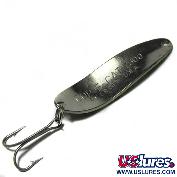 Auffällige neongrüne Akzente kontrastieren mit einem dunklen, segmentierten Muster auf diesem 10 g (1/3 oz) schweren Blinker. Mit einer Länge von 5,5 cm (2 1/4") besitzt dieser Dardevle Cop-E-Cat 7300 die markante längliche Form und die konkav geprägte Oberfläche, die Eppinger zu einem Begriff in amerikanischen Angelkästen machte. Unter dem Produktcode 0411 katalogisiert, nutzt dieses spezifische Farbschema kontrastreiche Markierungen, um die Sichtbarkeit bei verschiedenen Wassertrübungen zu gewährleisten. Eppinger fertigt diese seit 1906 in den USA, bevor der Betrieb 1959 nach Dearborn, Michigan, verlegt wurde, wo ihre geschützten Matrizen weiterhin diese klassische Silhouette produzieren. Der Zustand ist mit 4/5 respektabel, wobei das lebendige Finish und die Metallteile nur sehr leichte Gebrauchsspuren aufweisen. Ein silberfarbener Drilling ist sicher über einen robusten Sprengring an der Basis befestigt. Die Geometrie des Löffels ermöglicht eine gleichmäßige taumelnde Bewegung beim langsamen Einholen, ein Markenzeichen der über ein Jahrhundert währenden Ingenieursgeschichte des Herstellers.