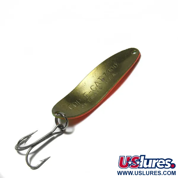 Mit einem Gewicht von 10 g bietet diese Kreation von Eppinger die nötige Masse für weite Würfe, selbst bei einer leichten Brise. Dieser Dardevle Cop-E-Cat 7300, identifiziert durch den Produktcode 0415, verfügt über ein gut sichtbares Fire Tiger-Muster auf einem massiven Messingkörper. Mit einer Länge von 5,5 cm (2 1/4") weist der Blinker die klassische längliche Form auf, die Lou Eppingers Designs seit den frühen 1900er Jahren in Detroit zu einem festen Bestandteil jeder Tackle-Box gemacht hat. Das Finish befindet sich in einem 4/5-Zustand und zeigt gut erhaltene Farben sowie deutliche schwarze vertikale Streifen, die sich scharf von dem orange-gelb-grünen Farbverlauf abheben. Auf der unteren Hälfte der konvexen Seite ist die markante Markenprägung in der Nähe des Sprengrings sichtbar. Die Ausstattung umfasst einen stabilen Drillingshaken, der über einen robusten Sprengring befestigt ist. Da er auf einer Messingbasis gefertigt ist, bietet er eine andere Lichtreflexion als vernickelte Versionen, was oft in klaren Gewässern bevorzugt wird, in denen ein dezenter Blitz erwünscht ist. Das Herstellungsverfahren dieser Köder ist nach wie vor in Michigan angesiedelt, wobei die Tradition der Verwendung firmeneigener Matrizen fortgesetzt wird, um die spezifische Krümmung des Metalls beizubehalten.