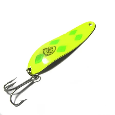 Auf der Rückseite des Blinkers ist die Modellbezeichnung „COP-E-CAT 7300 U.S.A.“ deutlich auf einem polierten Silber-Finish eingeprägt. Dieses 10 g (1/3 oz) schwere Exemplar mit dem Produktcode 0416 besticht durch eine Vorderseite in leuchtendem Fluoreszierend Gelb, die mit vier markanten grünen Rauten verziert ist. Mit einer Länge von 5,5 cm (2 1/4") behält der Metallkörper sein klassisches konkaves Profil bei – ein technisches Merkmal der Firma Eppinger, die diese Köder seit den frühen 1900er Jahren in Michigan herstellt. Auf der Vorderseite befindet sich das bekannte schwarze Teufelskopf-Logo, das charakteristisch für die Dardevle-Serie ist. Zur Ausstattung gehören ein funktionaler Sprengring und ein sauberer Drillingshaken. Der Köder weist nur leichte Gebrauchsspuren aus der Angelbox auf und befindet sich in einem Zustand von 4/5. Die polierte silberne Rückseite sorgt für einen kontrastreichen Blitz-Effekt gegenüber der hellen gelb-grünen Lackierung.