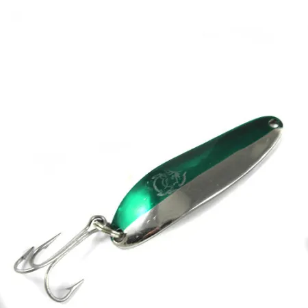 Nickel und transparentes Grün teilen sich die Vorderseite dieses mittelgroßen Blinkers, eine klassische Designwahl aus dem Eppinger-Katalog. Mit einer Länge von exakt 5,5 cm (2 1/4") weist dieser Dardevle Cop-E-Cat 7300 (Produktcode 0424) das ikonische Teufelskopf-Logo auf, das teilweise über dem grünen Finish eingestempelt ist. Die Rückseite offenbart seine Herkunft mit einer klaren Prägung „COP-E-CAT 7300 DETROIT USA“, was auf seine Entstehung vor dem Umzug des Unternehmens nach Dearborn im Jahr 1959 hindeutet. Mit einem Gewicht von 10 g (1/3 oz) ist er eine vielseitige Wahl für Angler, die im Süßwasser beim Spinnfischen oder Schleppangeln fischen. Zur Ausstattung gehört ein stabiler Drillingshaken, der mit einem Sprengring am Ende gesichert ist. Mit einer Zustandsbewertung von 4/5 behält der Blinker eine saubere, reflektierende Oberfläche sowohl auf dem Nickel- als auch auf dem farbigen Teil. Dieser in Amerika hergestellte Köder zeigt die spezifischen Fertigungsmatrizen, mit denen Eppinger seinen Ruf in Detroit begründete.