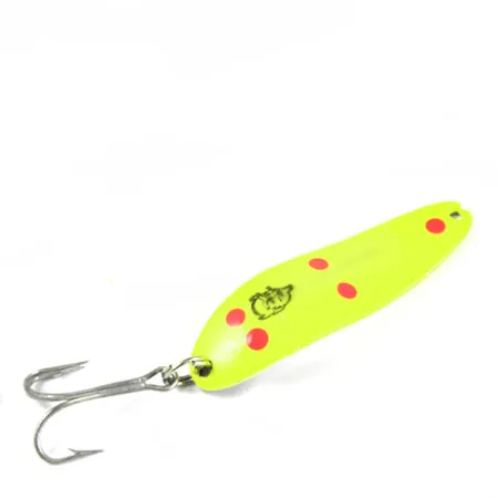 Poliertes Metall auf der Unterseite trägt die Prägung 'COP-E-CAT 7300 DETROIT USA', was diesen Blinker als ein frühes Eppinger-Modell kennzeichnet, bevor die Fabrik 1959 nach Dearborn umzog. Auf der konvexen Seite ist eine leuchtend gelbe Basis mit fünf roten Punkten und dem bekannten Teufelskopf-Logo versehen. Dieser 1/3 oz (10 g) schwere Blinker misst 5,5 cm (2 1/4") und bietet ein markantes Profil für verschiedene Süßwasserarten. Die Lackierung dieses Modells mit dem Produktcode 0425 ist in hervorragendem Zustand und erhält für seine glatte Oberfläche ohne Abplatzer eine Bewertung von 5/5. Zur Ausstattung gehören ein stabiler Sprengring und ein scharfer Drilling, was auf eine gute Konservierung über die Jahre hindeutet. Solche länglichen Löffelblinker werden mit speziellen Matrizen gefertigt, um eine gleichmäßige taumelnde Bewegung beim Einkurbeln oder Schleppen zu gewährleisten. Der Kontrast zwischen dem Neongelb und den roten Punkten sorgt für hohe Sichtbarkeit, während die silberfarbene Rückseite metallische Lichtreflexe erzeugt.