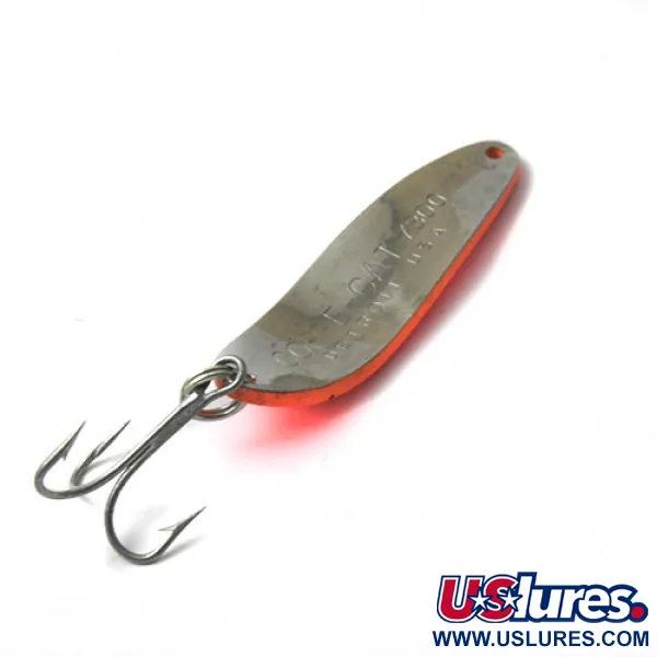 Sechs markante schwarze Punkte sind auf das leuchtend orangefarbene Finish dieses klassischen, in den USA hergestellten Löffelblinkers gestempelt. Mit einem Gewicht von 14 g (1/2 oz) und einer Länge von 5,5 cm (2 1/4") trägt dieser Eppinger Dardevle Cop-E-Cat 7300 das ikonische Devil Head-Logo, das diese in Michigan entstandenen Köder seit über einem Jahrhundert kennzeichnet. Die rötlich-orangefarbene Lackierung sorgt für ein kontrastreiches Profil, während der gestanzte Metallkörper für vielseitige Wurf- und Schleppanwendungen konzipiert ist. Die durch den Produktcode 0449 identifizierte Hardware besteht aus einem robusten Drillingshaken und einer zuverlässigen Sprengringmontage. Dieses Exemplar befindet sich in einem Zustand von 4/5, was die Langlebigkeit der ursprünglichen Fertigungsstandards von Lou Eppinger unterstreicht. Die konkave Innenfläche sorgt für die nötige Wasserverdrängung für seine charakteristische Bewegung in der Wassersäule.