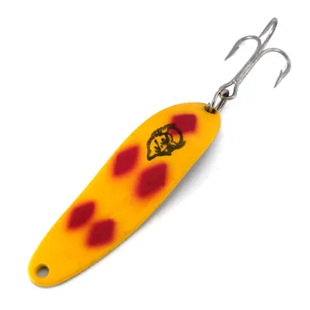 Fünf markante rote Rauten heben sich von der leuchtend gelben Lackierung dieses 5,5 cm (2 1/4") Blinkers ab und kennzeichnen ihn als das ikonische Five of Diamonds-Muster. Dieser Dardevle Cop-E-Cat 7300, Produktcode 10163, trägt das berühmte Teufelskopf-Logo, das deutlich auf der Vorderseite eingestempelt ist. Mit einem Gewicht von 10g (1/3oz) ist der Köder mit einem konkaven, länglichen Körper ausgestattet, der bei langsamem Einholen eine spezifische taumelnde Aktion erzeugt. Die Rückseite zeigt eine saubere kupferfarbene Basis, die mit den Markierungen „COP-E-CAT“ und „DETROIT“ versehen ist, was die tiefen Wurzeln des Herstellers in Michigan widerspiegelt, seit Lou Eppinger 1906 mit der Handfertigung von Ködern begann. Dieses Exemplar befindet sich in einem 5/5-Zustand mit kräftiger Lackierung und einem scharfen, silberfarbenen Drillingshaken, der an einem stabilen Sprengring befestigt ist. Wie alle Dardevle-Blinker wurde er in den USA mit firmeneigenen Matrizen hergestellt, um die exakte Krümmung zu gewährleisten, die für effektives Auswerfen oder Schleppfischen erforderlich ist. Die Kombination aus gelber Vorderseite und kupferner Rückseite bietet einen visuellen Kontrast, den erfahrene Angler bei wechselnden Sichtverhältnissen im Wasser bevorzugen.