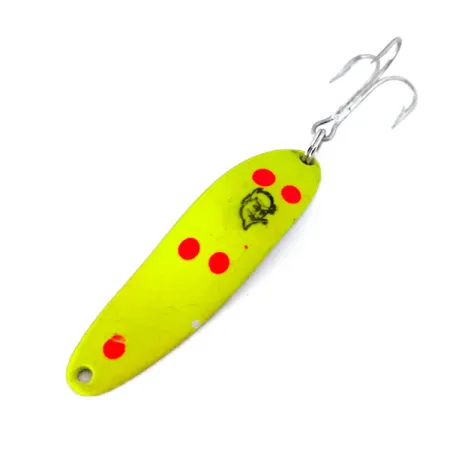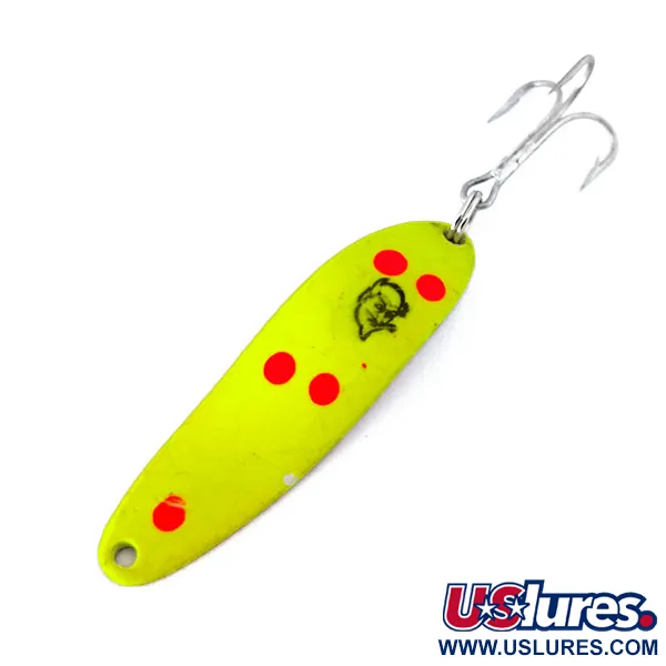 Fluoreszierende gelbe Farbe bedeckt die konvexe Seite dieses Blinkers, der entwickelt wurde, um in verschiedenen Wassertiefen aufzufallen. Mit einer Länge von 5,5 cm (2 1/4") und einem Gewicht von 10 g (1/3 oz) trägt dieser Eppinger Dardevle Cop-E-Cat 7300 den Produktcode 10359. Das Finish zeichnet sich durch kräftige rote Punkte auf einer gelben Basis aus, die sowohl fluoreszierend als auch UV-aktiv ist und unter ultraviolettem Licht ein hellgrünes Leuchten erzeugt, wie man es im Dunkeln sieht. Eine vernickelte Rückseite sorgt für den nötigen Blitzreflex, um die Lackierung zu ergänzen. Diese spezifische Form, die durch die firmeneigenen Fertigungsmatrizen von Eppinger in Michigan erreicht wird, erzeugt eine ausgeprägte taumelnde Aktion beim Einholen. Der Köder befindet sich in einem Zustand von 4/5, wobei die Farbe und das geprägte Teufelskopf-Logo scharf und deutlich erhalten sind. Er behält seine originale Hardware, einschließlich eines silberfarbenen Drillingshakens und eines Sprengrings.