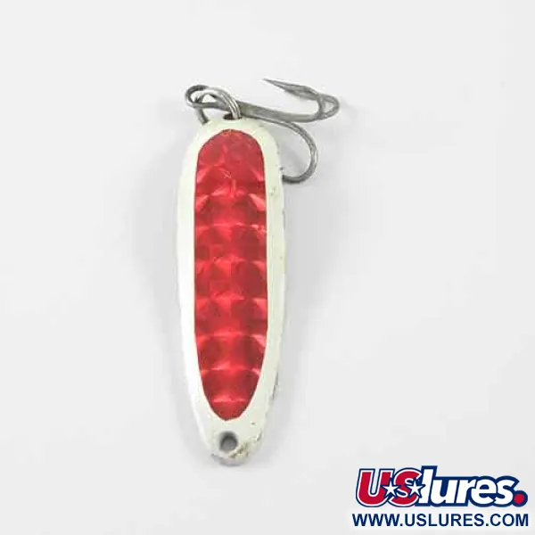 Ein strukturiertes rotes Schuppendekor-Tape erzeugt einen auffälligen Lichtreflex gegen den weiß emaillierten Rand dieses klassischen Eppinger Blinkers. Mit einer Länge von 5,5 cm (2 1/4") besitzt der Cop-E-Cat 7300 ein beachtliches Gewicht von 14 g (1/2 oz), das für weite Würfe oder zum Schleppangeln ausgelegt ist. Die Rückseite des Köders offenbart ein poliertes Nickel-Finish, in das die Prägung „COP-E-CAT 7300 Eppinger U.S.A.“ direkt in das Metall gestanzt wurde. Dieses spezifische Exemplar weist eine Zustandsbewertung von 4/5 auf, mit gut erhaltenen Farbpigmenten und durchgehend sauberen Oberflächen. Der Produktcode 1380 identifiziert diese spezielle Farbkombination im Katalog des in Michigan ansässigen Unternehmens, das bereits seit 1906 Angelgeräte herstellt. Ein einzelner Drillingshaken ist am hinteren Ende mit einem Sprengring befestigt und bereit für den Einsatz im Süßwasser.