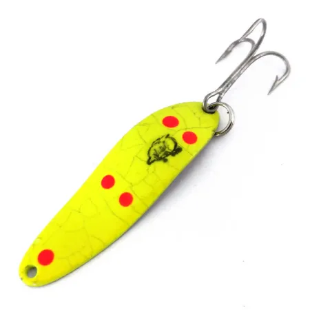 Mit einem Gewicht von 10 g (1/3 oz) besticht dieser Eppinger Dardevle Cop-E-Cat 7300 UV durch sein markantes fluoreszierend gelbes Crackle-Finish, das in jeder Köderbox sofort auffällt. Der 5,5 cm (2 1/4") lange Körper ist mit fünf kräftigen roten Punkten und dem klassischen schwarzen Teufelskopf-Logo verziert – ein Qualitätssiegel der Firma, die seit der Gründung durch Lou Eppinger in Detroit im Jahr 1906 besteht. Während er bei Tageslicht wie ein standardmäßiger Schockfarben-Blinker aussieht, lässt er die speziellen UV-Eigenschaften in dunklem oder tiefem Wasser hellgrün leuchten und bietet so ein völlig neues visuelles Profil für die Fische. Die vernickelte Rückseite sorgt für den traditionellen Flash-Effekt als Ergänzung zur lackierten Vorderseite. Dieses Exemplar befindet sich in einem 4/5-Zustand mit gut erhaltenem Lack und Original-Hardware. Er trägt den Produktcode 10110 und repräsentiert die langjährige amerikanische Tradition der urheberrechtlich geschützten Druckguss-Blinker von Eppinger. Die konkave, längliche Form ist zum Werfen oder Schleppen konzipiert – ein Design, das aufgrund seiner Fängigkeit seit über einem Jahrhundert nahezu unverändert geblieben ist.