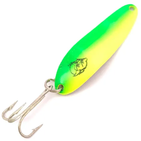 Ein lebhafter Chartreuse-Verlauf geht in ein leuchtendes Gelb auf der lackierten Vorderseite dieses 10 g (1/3 oz) schweren Blinkers über. Mit einer Länge von 5,5 cm (2 1/4") verfügt dieses spezifische Modell mit dem Produktcode 3920 über das klassische UV-Glow-Finish, das für Sichtbarkeit in tiefen oder trüben Gewässern konzipiert wurde. Ein markanter schwarzer Stempel eines Katzenkopfes sitzt prominent auf der oberen Hälfte, ein Markenzeichen der Cop-E-Cat-Serie. Auf der Rückseite des Köders ist die polierte Nickel-Oberfläche deutlich mit „COP-E-CAT 7300 DETROIT U.S.A.“ gestempelt, was auf die historischen Wurzeln des Unternehmens in Michigan vor dem Umzug nach Dearborn im Jahr 1959 verweist. Dieses Stück befindet sich in einem außergewöhnlichen 5/5-Zustand mit einer glänzenden, sauberen Oberfläche und scharfen Haken. Die Konstruktion umfasst einen robusten, silberfarbenen Drilling, der durch einen zuverlässigen Sprengring gesichert ist, bereit zum Werfen oder Schleppen. Die konkave Körperform ist ein Markenzeichen des Eppinger-Designs und sorgt für einen stabilen Lauf in der Wassersäule, während die fluoreszierende Farbe auf das verfügbare Licht reagiert.