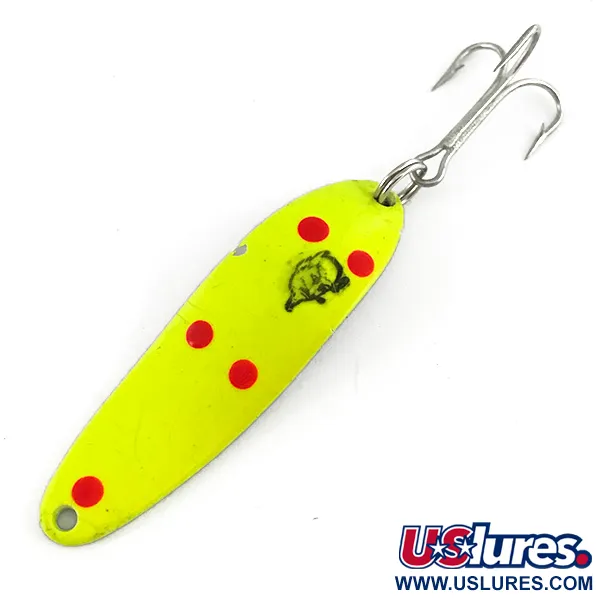 Mit einem Gewicht von genau 10 g (1/3 oz) ist der Cop-E-Cat 7300 UV perfekt für eine konstante Performance beim Auswerfen und Schleppangeln ausbalanciert. Sein Profil ist in einem gut sichtbaren Fluorgelb gehalten, das durch fünf kräftige rote Punkte akzentuiert wird – ein Muster, das speziell für die Reaktion unter ultraviolettem Licht entwickelt wurde. Wie auf dem zweiten Bild zu sehen ist, leuchtet die UV-aktive Beschichtung hellgrün, was dem Blinker hilft, für Raubfische in tieferem oder trübem Wasser, wo das natürliche Licht nachlässt, sichtbar zu bleiben. Die Vorderseite ist mit dem ikonischen Eppinger Teufelslogo geprägt, einem Markenzeichen des Herstellers aus Dearborn, Michigan, der bereits seit 1906 besteht. Mit einer Länge von 5,5 cm (2 1/4") trägt dieses Exemplar den Produktcode 7396 und befindet sich in einem 5/5-Zustand, ohne Anzeichen von Alter oder Abnutzung auf der lackierten Oberfläche. Die Ausstattung besteht aus einem hochbelastbaren Sprengring aus Metall und einem scharfen, silberfarbenen Drillingshaken, die beide original am Blinker verbaut sind.