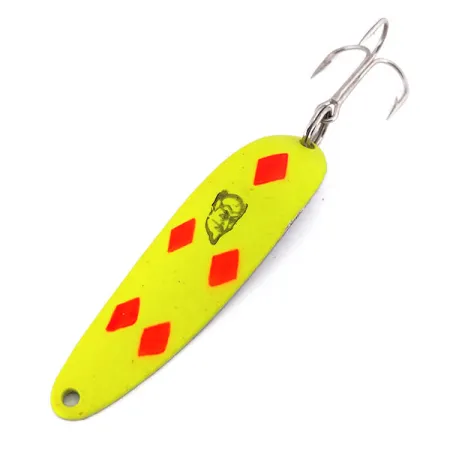 Mit einem Gewicht von 1/2 oz (14 g) und einer Gesamtlänge von 2 1/2" (6,5 cm) ist das klassische Five of Diamonds-Muster dieses Eppinger Dardevle Cop-E-Cat 7400 ein Muss für jede ernsthafte Köderbox. Dieses spezielle Modell mit dem Produktcode 10210 verfügt über ein UV Glow/Fluorescent-Finish, das selbst in tieferen oder trüben Gewässern weithin sichtbar bleibt. Das ikonische Teufelskopf-Logo ist sauber auf der gelben, konkaven Innenseite zentriert, flankiert von fünf scharfen roten Diamanten. Im Zustand 5/5 behält der Blinker sein glänzendes Werksfinish und ist mit originalen, hochwertigen Komponenten ausgestattet, darunter ein stabiler Sprengring und ein Drillingshaken. Eppinger fertigt diese Löffelblinker seit 1906 in Michigan unter Verwendung eigener Pressformen, um das spezifische Gewicht und die Balance für das charakteristische taumelnde Laufverhalten zu gewährleisten. Während das Standard-Five of Diamonds legendär ist, bietet diese fluoreszierende Version einen zusätzlichen technischen Vorteil beim Werfen oder Schleppen in der Dämmerung. Die Metallkonstruktion spiegelt die amerikanische Langlebigkeit wider, die diese Köder seit über einem Jahrhundert in Überlebenssets und Angeltaschen hält.