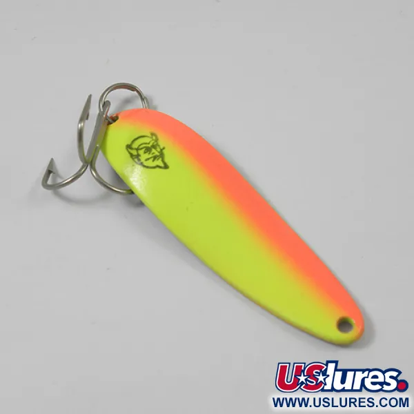 Ein Gewicht von 1/2 oz (14 g) ermöglicht weite Würfe und eine kontrollierte Sinkrate unter verschiedenen Bedingungen. Mit einer Länge von 2 1/2" (6,5 cm) besticht dieser Blinker durch ein neon-gelbes Finish mit einem weichen pinkfarbenen Verlauf am Rand und dem bekannten grünen 'Imp'-Logo. Auf der Rückseite ist das polierte Metall mit 'COP-E-CAT 7400' und 'EPPINGER MFG CO. DEARBORN MICH' gestempelt, was auf die Firmengeschichte nach dem Umzug 1959 hinweist. Dieses Exemplar mit dem Code 1996 befindet sich im Zustand 5/5, mit sauberem Lack und glänzender silberfarbener Rückseite. Der konkave, längliche Körper ist mit einem robusten Drilling ausgestattet und für das Wurfangeln sowie Schleppangeln konzipiert. Die spezielle Form erzeugt beim Einholen die charakteristische taumelnde Aktion, die die Köder von Eppinger seit über einem Jahrhundert auszeichnet.