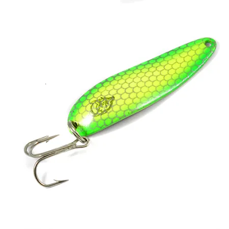 Mit einem Gewicht von 1/2 oz (14 g) präsentiert dieser Blinker ein lebhaftes limetten- und gelbes Waben-Schuppenmuster auf der Vorderseite. Die gestanzte Nickel-Rückseite zeigt deutlich die Markierungen "COP-E-CAT 7400" und "DETROIT U.S.A.", was dieses spezifische Exemplar mit der Produktionsgeschichte der Firma Eppinger in Michigan vor deren Umzug nach Dearborn im Jahr 1959 verbindet. Mit einer Länge von 2 1/2 Zoll (6,5 cm) besitzt der Löffel die klassische konkave Dardevle-Form, die für eine wackelnde Bewegung beim Einholen oder Schleppen entwickelt wurde. Dieser Artikel trägt den Produktcode 2094 und befindet sich in einem 5/5-Zustand, wobei er ein Hochglanzfinish und einen sauberen, silberfarbenen Drillingshaken bewahrt. Der Kontrast zwischen den leuchtenden Chartreuse-Schuppen und der polierten Nickel-Rückseite bietet ein visuelles Profil, das für unterschiedliche Wasserbedingungen geeignet ist. Dieser Metallkörper spiegelt dieselben hochwertigen Fertigungsmatrizen wider, die seit über einem Jahrhundert zur Herstellung dieser Köder verwendet werden. Ein stabiler Sprengring sichert die Hardware am Schwanzende.