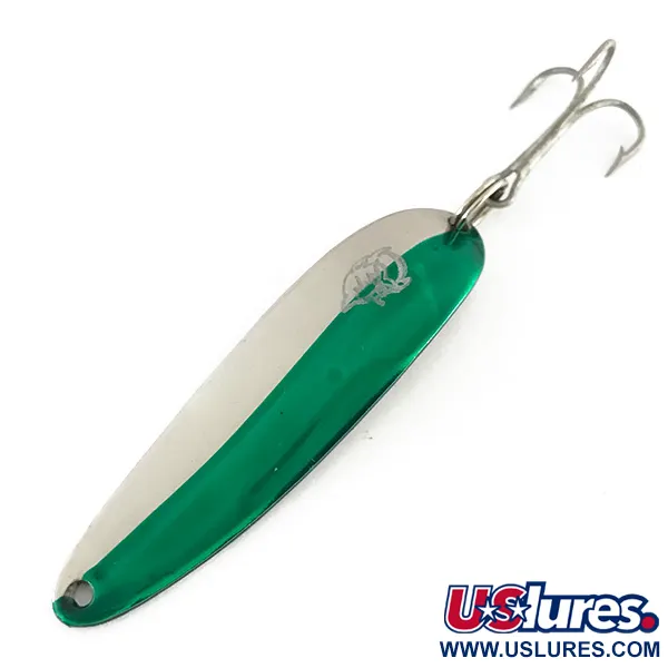 Ein markantes diagonales Design aus poliertem Nickel und lichtdurchlässigem Grün prägt das Erscheinungsbild dieses Modells. Mit einem Gewicht von 14 g (1/2 oz) ist dieser Eppinger Dardevle Cop-E-Cat 7400 ein klassischer Vertreter der Fischereitradition aus Detroit. Die Rückseite des Blinkers zeigt deutlich die eingestanzten Merkmale „COP-E-CAT 7400“ und „DETROIT U.S.A.“, was seine Herkunft aus den ursprünglichen Wurzeln der Marke in Michigan unterstreicht. Bei einer Länge von 6,5 cm (2 1/2") ist das ikonische Teufelskopf-Logo auf der grün getönten Seite des Metalls eingraviert. Der robuste Drillingshaken ist sicher über einen Sprengring am Heck befestigt, wodurch er sich sowohl zum Spinnfischen als auch zum Schleppen eignet. Dieses spezielle Exemplar mit dem Produktcode 8392 weist eine Zustandsbewertung von 5/5 auf und zeigt die glänzenden Reflexionen und sauberen Oberflächen, die man von einem gut erhaltenen Sammlerstück erwartet. Die konkave Form des Blattes ist ein Markenzeichen der Designphilosophie von Eppinger, die 1906 in Lou Eppingers Keller begann.