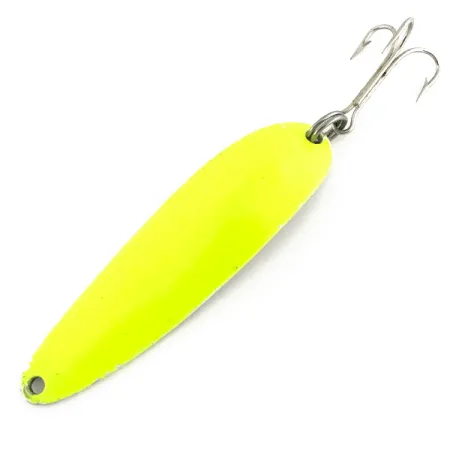 Mit einer Länge von 2 1/2" (6,5 cm) bietet dieser Blinker ein markantes Profil, das seit über einem Jahrhundert zur Grundausstattung jeder Tacklebox gehört. Der Dardevle Cop-E-Cat 7400 UV (Artikelnummer 8721) ist mit dem legendären Namen Eppinger geprägt und verfügt über ein leuchtend gelbes Finish, das unter UV-Licht in ein strahlendes Fluoreszenz-Grün wechselt. Mit einem Gewicht von 1/2 oz (14 g) bietet er genug Masse für weite Würfe oder kontrolliertes Schleppfischen. Die Rückseite ist in glänzendem Nickel gehalten, was einen starken Kontrast zur neonfarbenen Vorderseite bildet, um Raubfische in tiefem oder trübem Wasser zu locken. Eppinger fertigt diese Köder seit 1906 in Michigan unter Verwendung eigener Matrizen, um die spezifische längliche Form und die konkave Oberfläche zu erhalten. Die Ausstattung ist robust, mit einem stabilen Sprengring und einem scharfen Drillingshaken. Bei einem Zustand von 5/5 ist das Finish makellos und die Neon-Pigmente sind außergewöhnlich kräftig.