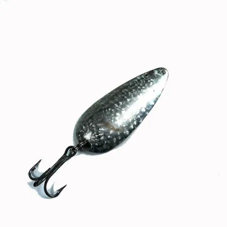 Ausgestattet mit einem gehämmerten „Crystal“-Silberschuppen-Finish reflektiert dieser klassische Blinker das Licht über seine vertiefte Oberfläche, um die Aufmerksamkeit von Tiefwasser-Raubfischen zu erregen. Dieser 21 g (3/4 oz) schwere Casting-Blinker ist 7 cm (2 3/4 Zoll) lang und weist das ikonische längliche, konkave Profil auf, das Eppinger in Michigan seit der Firmengründung im Jahr 1906 perfektioniert hat. Dieser Dardevle Dardevlet, gelistet unter dem Produktcode 0334, repräsentiert die zuverlässige Handwerkskunst, die Lou Eppinger in seinem Keller in Detroit begründet hat. Bei näherer Betrachtung der Hardware zeigen sich das strukturierte Finish und der dunkle Drilling in einem soliden 4/5-Zustand. Der massive Metallkörper ist für ein langsames, gleichmäßiges Einholen ausgelegt – ein Beweis für ein Design, das so effektiv war, dass es einst in Überlebenskits der US-Militärluftfahrt enthalten war. Der Haken ist sicher über einen stabilen Sprengring am Ende des tropfenförmigen Körpers befestigt.