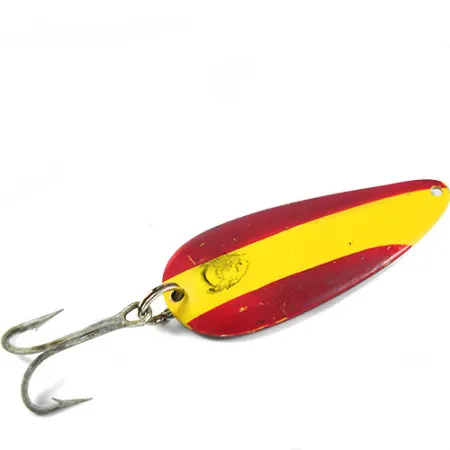 Roter Emaillelack mit einem markanten gelben Längsstreifen prägt die Optik dieses Dardevle Dardevlet, der unter dem Produktcode 0339 geführt wird. Mit einem Gewicht von 21 g (3/4 oz) verfügt der Blinker über einen robusten, 7 cm (2 3/4") langen Metallkörper, der von der Firma Eppinger aus Dearborn, Michigan, gefertigt wurde. Das berühmte „Teufelskopf“-Logo ist deutlich in das mittlere gelbe Band eingeprägt – ein Echtheitsmerkmal dieser in den USA hergestellten Köder. Das Finish weist leichte Altersspuren auf, was ihm eine solide Zustandsbewertung von 4/5 einbringt, während der lebendige Farbkontrast erhalten bleibt. Ein klassischer Drillingshaken ist über einen stabilen Sprengring montiert und bereit zum Werfen oder Schleppen. Die konkave Form ist so konzipiert, dass sie die charakteristische taumelnde Bewegung erzeugt, die diese Blinker seit Lou Eppingers ersten handgepressten Modellen im Jahr 1906 zum Standard in jeder Tacklebox gemacht hat. Das Gewicht von 21 g (3/4 oz) bietet genug Masse für weite Würfe, selbst bei Gegenwind.
