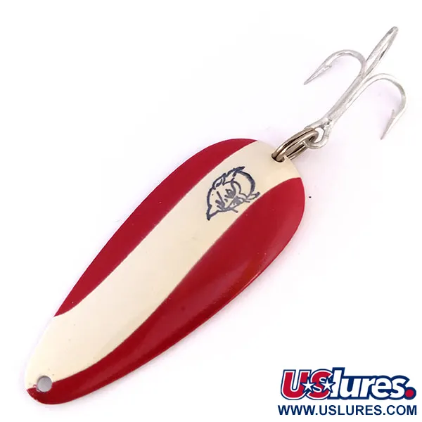 In die nickel-beschichtete Rückseite sind deutlich die Worte „DARDEVLET“ und „DETROIT“ eingeprägt, die diesen Klassiker von Eppinger, dem Tackle-Hersteller aus Michigan, kennzeichnen. Dieses Exemplar mit dem Produktcode 10009 trägt das berühmte rot-weiß gestreifte Emaille-Finish mit dem ikonischen blauen Teufelskopf-Logo in der Mitte des cremefarbenen Streifens. Mit einer Länge von 7 cm (2 3/4") und einem Gewicht von 21 g (3/4 oz) ist die schwere Metallkonstruktion des Blinkers zum Werfen oder Schleppen konzipiert. Der Zustand ist mit 5/5 hervorragend, mit einer hochglänzenden Lackierung und einer hellen, reflektierenden Nickeloberfläche auf der konkaven Seite. Er ist mit Original-Hardware ausgestattet, darunter ein starker Sprengring und ein großer Drillingshaken. Die Detroit-Prägung auf der Rückseite ist ein spezifisches historisches Detail, da Lou Eppinger die Produktion 1959 von Detroit nach Dearborn verlegte, was diesen Köder in eine bestimmte Ära der amerikanischen Köderherstellung einordnet. Die tief konkave Form ist präzise gepresst, um das für Tiefwasserpräsentationen erforderliche Gewicht zu liefern.