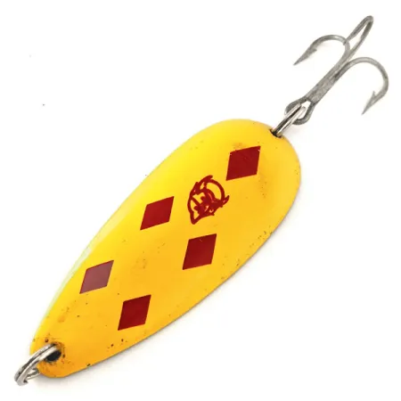 Mit einem Gewicht von 21 g (3/4 oz) besticht dieser Eppinger Blinker durch das ikonische Five of Diamonds-Muster, das aus fünf tiefroten Rauten auf leuchtend gelbem Grund besteht. Bei diesem Exemplar handelt es sich um den Dardevle Dardevlet mit einer Länge von 7 cm (2 3/4"), ein Klassiker für Liebhaber von Angelgeräten aus Michigan. Die Vorderseite ziert das traditionelle rote Teufelskopf-Logo, während die Rückseite aus gestanztem Messing die Herkunft aus Dearborn, Michigan, bestätigt. Dieses Modell mit der Artikelnummer 11970 befindet sich in einem 5/5-Zustand und weist ein sauberes Finish sowie eine hervorragend erhaltene Lackierung auf, die das Erbe der Entwürfe von Lou Eppinger unterstreicht. Die Fertigung erfolgt mit den herstellereigenen Matrizen, um die spezifische längliche Form und die konkave Oberfläche zu erzielen, die für traditionelle Wurftechniken erforderlich sind. Ausgestattet ist er mit Originalkomponenten, darunter ein scharfer Drillingshaken und robuste Sprengringe, die durch präzise gebohrte Ösen befestigt sind.