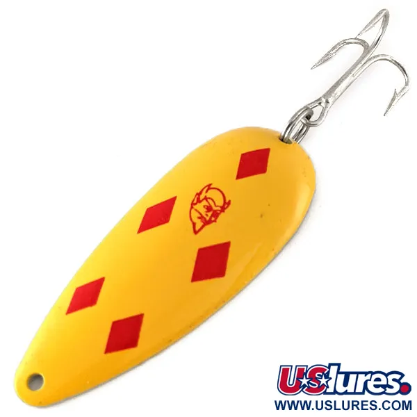 Dieser klassische Blinker wiegt 21 g (3/4 oz) und besticht durch das legendäre Five of Diamonds-Muster, bestehend aus fünf scharfkantigen roten Rauten auf leuchtend gelbem Emaille. Auf der Rückseite des 7 cm (2 3/4 Zoll) langen Blattes sind der Name Dardevlet und der Standort Dearborn, MI eingestanzt – ein Markenzeichen der Eppinger-Produktion seit dem Umzug des Unternehmens im Jahr 1959. Dieses spezielle Exemplar mit dem Produktcode 12338 befindet sich in einem 5/5-Zustand mit einem bemerkenswert sauberen Finish und ohne sichtbare Lackabnutzung durch Haken. Das klassische Teufelskopf-Logo ist mittig zwischen den Rautenmotiven auf der konvexen Seite aufgedruckt. Ein stabiler silberfarbener Drillingshaken ist mit einem hochbelastbaren Sprengring befestigt, bereit zum Werfen oder Schleppen. Die polierte, messingfarbene Unterseite ist glänzend geblieben und spiegelt die hohen Qualitätsstandards wider, für die das in Michigan ansässige Unternehmen seit über einem Jahrhundert steht.