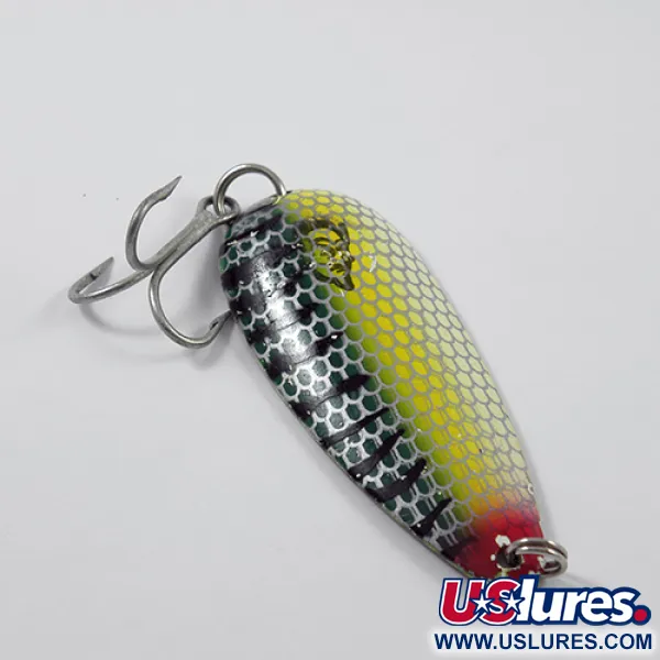 Ein Messing-Finish auf der konkaven Seite dieses 3/4 oz (21 g) Blinkers zeigt die eingestanzten Hallmarks „Dardevlet“ und „Eppinger“. Dieses 2 3/4 Zoll (7 cm) lange Exemplar mit dem Produktcode 2691 präsentiert ein Barsch-Farbmuster mit einer gelb-grünen Wabenstruktur-Schuppenoberfläche über vertikalen schwarzen Streifen und roten Akzenten an den Enden. Eppinger verlagerte die Produktion 1959 von Detroit nach Dearborn, Michigan, und verwendet weiterhin eigene Matrizen, um diese spezifische längliche Form zu erzielen, die die Marke seit über einem Jahrhundert prägt. Die Hardware besteht aus einem klassischen Drilling, der mit einem Sprengring befestigt ist. Der Zustand liegt bei 4/5, mit einer sauberen Oberfläche und minimalen Gebrauchsspuren über die Jahre. Bei der Führung dieses Köders ermöglicht das schwere Messinggehäuse bei langsamem Einholen ein effektives Aufblitzen. Die Zuverlässigkeit dieses Designs ist legendär; aufgrund seiner bewährten Fängigkeit war es in Kriegszeiten sogar Teil von Überlebenssets in der Luftfahrt. Die Kombination aus der strukturierten Schuppenoberfläche und der warmen Messingunterseite macht ihn zu einem Standard für Angler, die auf Raubfische in verschiedenen Wassertrübungen fischen.