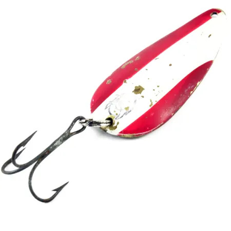 Mit einem Gewicht von 21g (3/4oz) bringt dieser Vintage-Blinker die unverkennbare Masse einer echten Wurflegende mit. Bei einer Länge von 7 cm (2 3/4") zeigt der Eppinger Dardevle Dardevlet mit dem Produktcode 3133 das klassische rot-weiß gestreifte Dekor auf der Oberseite. Kleine Lackabplatzer geben den Blick auf den Messingkern frei und verleihen dem Köder Charakter, der sichtlich regelmäßig zum Einsatz kam. Die Rückseite weist die direkt in das Messing gepressten Prägungen „DARDEVLET“ und „DETROIT U.S.A.“ auf – ein Detail, das seine Entstehung vor dem Umzug des Unternehmens nach Dearborn im Jahr 1959 belegt. Dieses Exemplar mit einer Bewertung von 4/5 besitzt noch den Original-Drilling und ist ein exzellentes Beispiel für die speziellen Stanzformen, die Lou Eppinger in Michigan populär machte. Dank seiner konkaven Wölbung und der massiven Bauweise eignet er sich gleichermaßen für weite Würfe wie für das tiefe Schleppangeln.