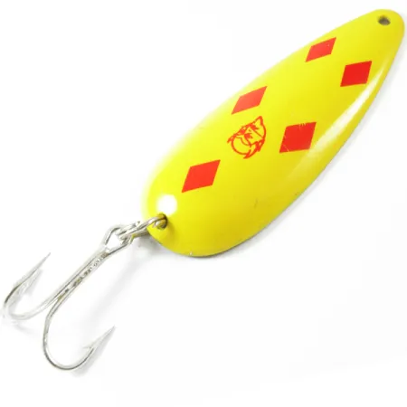 Ein leuchtend gelbes Emaille-Finish kennzeichnet sofort das klassische „Five of Diamonds“-Muster auf diesem Exemplar. Mit einem Gewicht von 21 g (3/4 oz) und einer Länge von 7 cm (2 3/4") trägt dieser Dardevle Dardevlet den Produktcode 3449. Die konvexe Seite zeigt fünf scharf gezeichnete rote Karos, die das bekannte rote Teufelskopf-Logo flankieren, während die Rückseite eine polierte Messingoberfläche mit der deutlich eingestanzten Aufschrift „DARDEVLE“ und „MADE IN USA“ aufweist. Die konkave Form ist ein Markenzeichen der Produktion von Eppinger aus Michigan und wurde entwickelt, um bei langsamem Einholen eine spezifische taumelnde Aktion zu erzeugen. Dieser spezielle Blinker befindet sich in einem 5/5-Zustand, wirkt unbenutzt und verfügt über den originalen vernickelten Drilling und Sprengring. Seit 1906 verwendet Eppinger eigene Matrizen, um diese spezifischen Abmessungen beizubehalten – ein Qualitätsniveau, das diese Löffel einst zur Standardausrüstung in Überlebenskits der Militärluftfahrt machte. Der Kontrast zwischen der leuchtend gelben Vorderseite und der metallischen Messingrückseite sorgt für den nötigen optischen Reiz für Hechte und andere Raubfischarten.