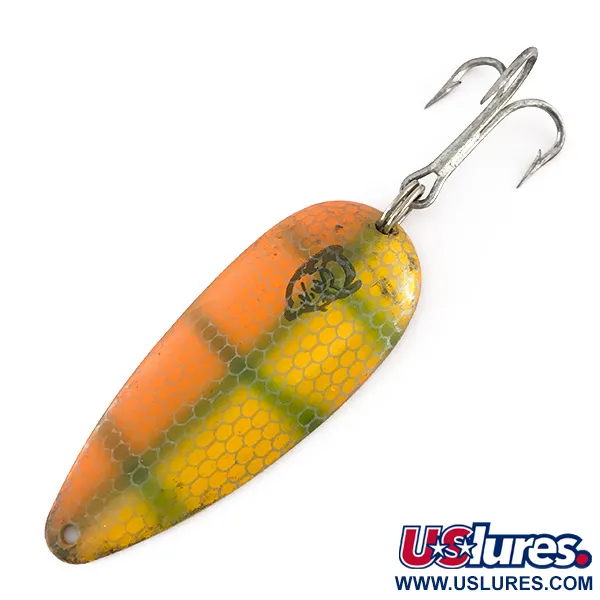 Die polierte Vernickelung auf der Rückseite dieses 21g (3/4oz) Löffelblinkers reflektiert das Licht und zeigt die markanten Prägungen „DARDEVLET“ und „DEARBORN MI“, die bei Sammlern so begehrt sind. Mit einer Länge von 7 cm (2 3/4") präsentiert die Vorderseite dieses Köders eine auffällige Kombination aus orangefarbenen und grünen Farbtönen in einem Kreuzmuster. Eine feine Wabenstruktur (Honeycomb) verleiht der lackierten Oberfläche, auf der das berühmte schwarze Teufelskopf-Logo klar erkennbar bleibt, eine schimmernde Textur. Dieser unter dem Code 8412 geführte Blinker wird mit den exklusiven Pressformen von Eppinger gefertigt, die für die spezifische Wölbung sorgen, welche sein charakteristisches Taumeln ermöglicht. Die Montage ist in hervorragendem Zustand, ausgestattet mit einem stabilen Sprengring und einem glänzenden Drillingshaken. Aus dem Werk in Dearborn stammend, das 1959 zum Sitz der Marke wurde, ist dieses Exemplar ein hervorragendes Beispiel amerikanischer Angelgeschichte. Der Zustand wird mit 5/5 bewertet und unterstreicht die klassische Qualität aus Michigan.