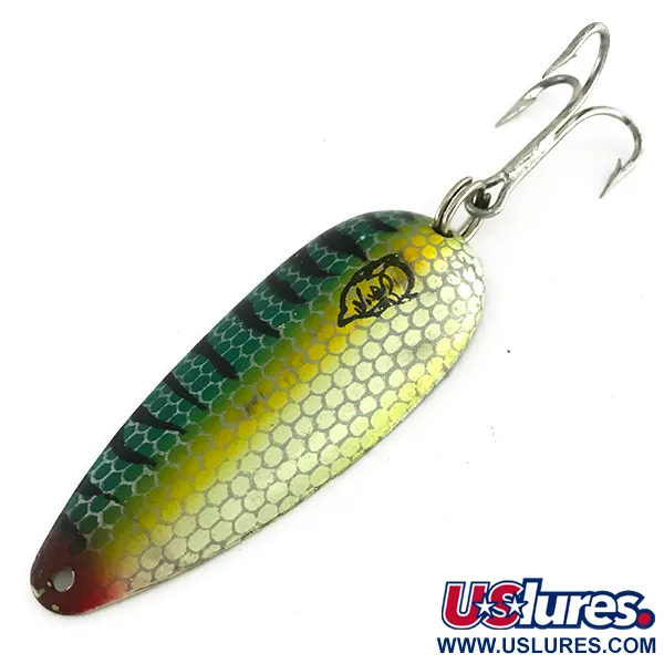 Auf der messingfarbenen Rückseite ist der Name "DARDEVLET" zusammen mit der Herkunft "DEARBORN MI" und der Gewichtsangabe "3/4 OZ." deutlich eingeprägt. Dieser 21 g (3/4 oz) schwere Löffelblinker besticht durch das markante Barsch-Dekor, das mit einer schuppenartigen Wabenstruktur über einem leuchtend gelb-grünen Farbverlauf umgesetzt wurde. Dunkle vertikale Streifen sorgen für einen realistischen Kontrast, abgerundet durch einen dezenten roten Akzent an der Spitze nahe der Öse. Die Vorderseite zeigt markant das ikonische schwarze Teufelskopf-Logo, ein Markenzeichen der Marke Eppinger seit ihrer Gründung im Jahr 1906. Mit einer Länge von 7 cm (2 3/4") ist der Köder mit einem robusten Drilling ausgestattet, der über einen Sprengring am Heck befestigt ist. Dieses Exemplar mit dem Produktcode 8442 befindet sich in einem außergewöhnlichen Zustand und erhält mit seinen sauberen Oberflächen und scharfen Prägungen die Bewertung 5/5. Da Eppinger die Produktion 1959 nach Dearborn verlegte, ist dieser Köder ein wesentliches Stück Angelgeschichte aus Michigan. Seine Fertigung aus massivem Messing und das gewichtete Profil sind für das Auswerfen und Schleppangeln unter verschiedenen Wasserbedingungen ausgelegt.