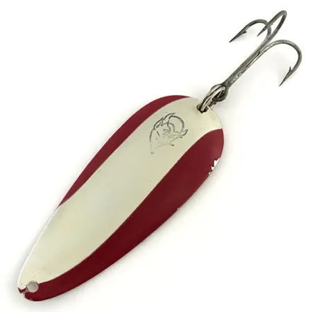 Deutlich auf der vernickelten Rückseite eingestempelt ist das Markenzeichen „DARDEVLET DETROIT U.S.A.“, das diesen Blinker als geschichtsträchtiges Exemplar der Fischereigeschichte Michigans ausweist. Dieses Exemplar mit dem Produktcode 8764 wiegt 3/4 oz (21 g) und hat eine Länge von 2 3/4" (7 cm). Das klassische rot-weiß gestreifte Muster auf der konvexen Seite bildet einen Kontrast zur polierten Nickelrückseite – eine Kombination, die Eppinger entwickelte, um Raubfische bei unterschiedlichen Sichtverhältnissen anzulocken. Das Teufelskopf-Logo auf der Vorderseite ist gut erkennbar, und der Zustand wird mit 5/5 bewertet, mit einer sauberen Oberfläche und nur leichten Altersspuren an den Rändern des Löffels. Die Hardware ist zeitgenössisch und besteht aus einem Drillingshaken, der mit einem Sprengring befestigt ist, ausgelegt für das schwere Wurfangeln auf Hecht oder Lachs. Das ursprüngliche Konzept von Lou Eppinger aus dem Jahr 1906 nutzte die spezifische Wölbung des Dardevlet, um bei langsamem Einholen eine ausgeprägte taumelnde Bewegung zu erzeugen. Selbst die Öse an der Spitze ist unversehrt und weist keine nennenswerten Abnutzungserscheinungen auf.