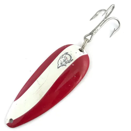 Ein auffälliges rot-weißes Emaille-Muster ziert die Vorderseite dieses 21 g (3/4 oz) schweren Dardevle Dardevlet, das berühmte Teufelskopf-Logo prangt mittig auf dem diagonalen Streifen. Mit einer Länge von 7 cm (2 3/4") ist die Tropfenform dieses Blinkers eine traditionelle Wahl zum Spinnfischen oder Schleppen. Die Rückseite des Köders besteht aus glänzend poliertem Nickel, geprägt mit dem Namen 'DARDEVLET' und dem Standort 'DEARBORN, MICH' – ein Markenzeichen der Fertigung von Eppinger seit dem Umzug aus Detroit im Jahr 1959. Die Gewichtsangabe 3/4 OZ ist ebenfalls deutlich auf der unteren Hälfte eingeprägt. Der Blinker ist mit einem scharfen Drillingshaken ausgestattet, der über einen stabilen Sprengring befestigt ist. Mit einer Zustandsbewertung von 5/5 bewahrt dieses Exemplar ein hochreflektierendes Metallfinish und präzise Lackkanten. Der verjüngte Kopf verfügt über eine saubere Öse für die Schnurbefestigung, bereit für einen Karabiner oder einen direkten Knoten. Dieses spezifische Modell mit der Artikelnummer 8879 repräsentiert die hochwertigen US-Fertigungsstandards, die der Hersteller seit über einem Jahrhundert pflegt.