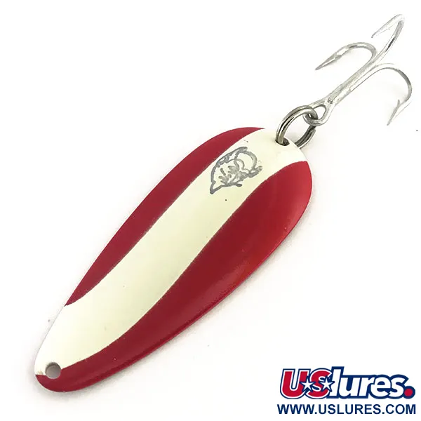 Poliertes Kupfer auf der Rückseite kennzeichnet dieses Exemplar als traditionelle Eppinger-Kreation, komplett mit der Einprägung „DARDEVLET“ DETROIT U.S.A. Ein robuster, silberfarbener Sprengring verbindet den 7 cm (2 3/4") langen Blinker-Körper mit einem scharfen Drillingshaken. Unter der Artikelnummer 8943 gelistet, ist dieser 21 g (3/4 oz) schwere Köder auf der Vorderseite mit den erkennbaren roten und weißen vertikalen Streifen versehen. Das charakteristische Teufelskopf-Logo ist deutlich sichtbar in den weißen Mittelstreifen eingeprägt. Die Detroit-Prägung auf dem Kupferrücken weist auf die frühe Geschichte des Herstellers in Michigan hin und datiert dieses Design vor den Umzug nach Dearborn im Jahr 1959. Mit einer sehr sauberen Oberfläche und gut erhaltener Farbe wird der Zustand dieses Exemplars mit 5/5 bewertet. Er ist aus schwerem Metall gefertigt, das für Wurfweite und Tiefenkontrolle unter verschiedenen Wasserbedingungen konzipiert wurde.
