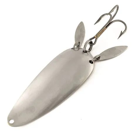 Mit einem Gewicht von 21 g bleibt dieser Blinker aus dickem Metall ein begehrtes Sammlerstück für Fans von Angelgeräten aus Michigan. Das Markenzeichen des Dardevlet Klicker-Modells sind die zwei kleinen, tränenförmigen Metallplättchen, die neben dem Drillingshaken am hinteren Sprengring befestigt sind. Diese Plättchen schlagen beim Einholen gegen den Hauptkörper des Blinkers und erzeugen so ein mechanisches Klickgeräusch, das den visuellen Reiz des silbernen Finishs ergänzt. Die Rückseite ist mit der klaren, tief gestempelten Aufschrift „DARDEVLET“ aus „DETROIT U.S.A.“ versehen, einem Herkunftsnachweis aus der Zeit vor dem Umzug von Eppinger nach Dearborn im Jahr 1959. Mit einer Länge von 7 cm und der Artikelnummer 12300 ist dieses Exemplar bemerkenswert gut erhalten. Die polierte silberne Oberfläche ist frei von nennenswerten Makeln oder Oxidation und spiegelt den Zustand 5/5 wider. Ein stabiler Drillingshaken ist über einen robusten Sprengring befestigt, bereit für das Wurfangeln oder Schleppen, wo die Kombination aus Lichtreflexion und Schall gefragt ist.