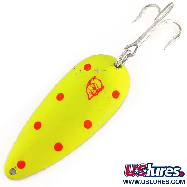 Mit einer Länge von 7 cm (2 3/4 Zoll) ist dieser Blinker in auffälligem Chartreuse mit rosa Punkten auf einer polierten Nickelbasis gehalten. Dieses Dardevlet-Modell mit dem Produktcode 12410 wiegt 21 g (3/4 oz) und trägt die legendäre rote Teufelskopf-Prägung – eine Hommage an die Anfänge der Marke in Detroit unter Lou Eppinger im Jahr 1906. Als fluoreszierende UV-Glow-Variante konzipiert, sorgt die Speziallackierung für ein kräftiges grünes Leuchten in lichtarmen Umgebungen, was ihn zur technischen Wahl für Tiefwasseranwendungen macht. Der Köder ist mit einem scharfen Drillingshaken und einem robusten Sprengring ausgestattet, die beide minimale Gebrauchsspuren aufweisen. Im aktuellen Zustand (5/5) ist die Lackierung außergewöhnlich sauber und die Nickelbeschichtung auf der Rückseite bleibt glänzend. Eppinger verwendet spezielle, geschützte Matrizen, um die charakteristische längliche Form des Metalls zu erzeugen, die erhebliche Wurfweiten auch bei windigen Bedingungen ermöglicht.