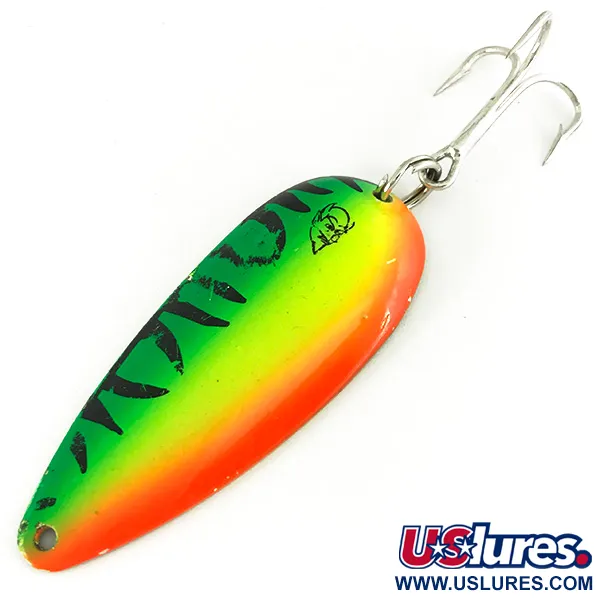 Mit einem Gewicht von 21 g (3/4 oz) verfügt dieser gestanzte Metallblinker über ein gesättigtes Fire Tiger-Dekor, das für maximale Sichtbarkeit entwickelt wurde. Dieses spezifische Dardevlet UV-Modell mit der Artikelnummer 7211 ist 7 cm (2 3/4") lang und trägt das eingestanzte Teufelskopf-Logo in der Nähe des oberen Sprengrings. Hergestellt in den USA von Eppinger, zeichnet sich der Köder durch seine charakteristische konkave Form aus, die die Marke seit Lou Eppingers Anfängen in Detroit definiert. Die fluoreszierende Lackierung ist UV-reaktiv – eine moderne Weiterentwicklung des klassischen Blinkers, um in tiefem oder trübem Wasser aufzufallen. Die Ausstattung umfasst einen robusten Sprengring und einen scharfen Drillingshaken, wobei der Zustand mit 5/5 bewertet wird. Sammler werden den präzisen Übergang zwischen den grünen, gelben und orangefarbenen Verläufen auf der Vorderseite bemerken, der durch kräftige schwarze Tigerstreifen kontrastiert wird. Die Rückseite bleibt schlicht und spiegelt den Fertigungsstandard des Werks in Dearborn wider.