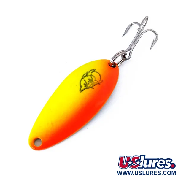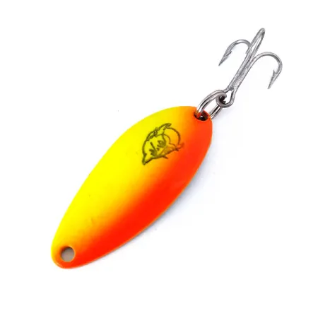 Mit einem lebendigen Farbverlauf von Sonnengelb bis hin zu feurigem Orange ist die Lackierung dieses Blinkers für maximale visuelle Reizwirkung konzipiert. Das Eppinger-Werk in Michigan stanzt diese Köder bereits seit 1906, und dieser Dardevle Devle Dog 5200 UV mit dem Produktcode 10450 ist ein Beleg für dieses Erbe. Unter UV-Licht strahlt das fluoreszierende Finish ein starkes grünes und orangefarbenes Leuchten aus, was die Sichtbarkeit in trübem Wasser oder in größeren Tiefen bei wenig Licht gewährleistet. Die Vorderseite ist mit dem klassischen Teufelskopf-Logo versehen, während die Rückseite eine saubere Vernickelung aufweist. Mit einer Länge von 4 cm (1 1/2") und einem Gewicht von 7 g (1/4 oz) ist er eine ausgewogene Wahl für eine Vielzahl von Fischarten. Dieses Exemplar befindet sich in unbenutztem Zustand und hat seinen ursprünglichen Werksglanz bewahrt. Die Montage besteht aus einem robusten Sprengring und einem scharfen Drilling, sodass der Köder sofort einsatzbereit für die Angelkiste ist.