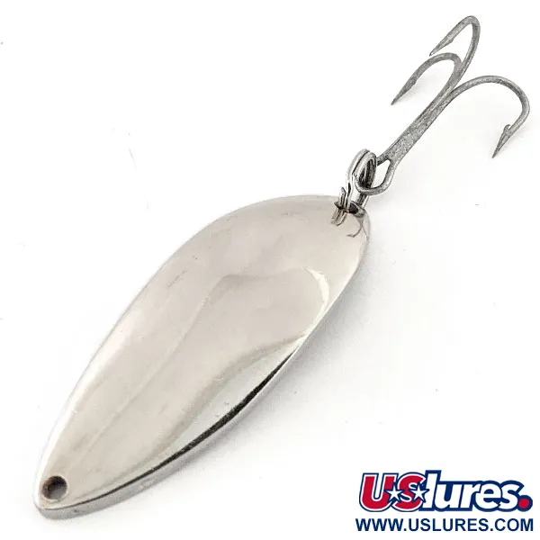 Mit einem Gewicht von 2/3 Unzen (18 g) ist dieser schwere Weitwurfblinker ein klassisches Exemplar der 5400er Serie aus dem Hause Eppinger. Das polierte Nickel-Finish ist makellos und erhält eine Zustandsbewertung von 5/5. Auf der konkaven Rückseite ist deutlich das Markenzeichen 'DEVLE-DOG DETROIT U.S.A.' eingestempelt, was diesen Köder in die historische Ära des Unternehmens in Michigan vor dem Umzug im Jahr 1959 einordnet. Mit einer Länge von 2 1/4" (5,5 cm) weist der Blinker die traditionelle längliche Silhouette und die tiefe Wölbung auf, die diese in den USA hergestellten Löffel charakterisieren. Die Montage besteht aus einem robusten Sprengring und einem großen Drillingshaken, ideal für schwere Süßwasseranwendungen. Das durch den Produktcode 12824 identifizierte Exemplar zeigt die präzise Metallverarbeitung, die durch die firmeneigenen Matrizen des Herstellers erzielt wurde. Die hohe Reflektionskraft der Nickeloberfläche eignet sich besonders gut für das Angeln in klaren Gewässern, wo Lichtreflexe der primäre Reiz für Raubfische sind.