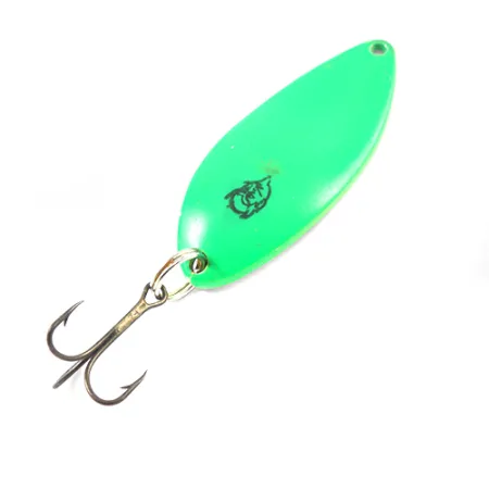 Ein kräftiger grüner Lack überzieht die konvexe Seite dieses klassischen Blinkers, verziert mit dem legendären schwarzen Teufelskopf-Logo. Mit einem Gewicht von 21 g (3/4 oz) und einer Länge von 6,5 cm (2 1/2") ist dieser Dardevle Devle Dog 7800 (Code 1803) ein fester Bestandteil des Eppinger-Sortiments. Die Rückseite besticht durch ein poliertes Nickel-Finish mit der deutlich sichtbaren Prägung 'DEVLE-DOG 7800 DETROIT U.S.A.', ein Hinweis auf die historischen Wurzeln des Unternehmens in Detroit vor dem Umzug im Jahr 1959. Dieses Exemplar weist eine Bewertung von 4/5 auf, mit gut erhaltenen Komponenten und einem sauberen Finish. Die Ausstattung umfasst einen stabilen Sprengring und einen scharfen Drillingshaken mit Bronze-Finish. Während Eppinger für das traditionelle rot-weiße Streifenmuster berühmt ist, bietet diese komplett grüne Variante ein markantes Profil für spezifische Lichtverhältnisse im Wasser. Die längliche Form und der konkave Bauch werden mit speziellen Matrizen präzisionsgefertigt – eine Technik, die Lou Eppinger bereits 1906 einführte, um eine gleichbleibende Qualität zu garantieren. Dieser Blinker ist für das Auswerfen und Einholen konzipiert, wobei das Gewicht für Weite sorgt und das geschwungene Profil das typische seitliche Ausbrechen erzeugt.