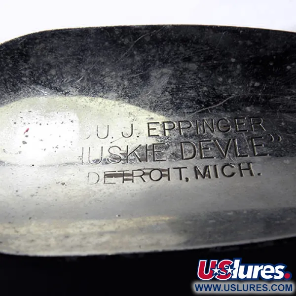 Mit einem stolzen Gewicht von 3 1/4 oz (91 g) ist dieser schwere Blinker für das Wurfangeln im Tiefwasser oder das Schleppangeln auf kapitale Raubfische konzipiert. Dieses Modell von Eppinger, bekannt als Huskie Devle (Artikelnummer 0245), hat eine stattliche Länge von 5 1/2" (14 cm). Das klassische Rot/Weiß-Finish auf der Vorderseite wird durch eine markante Wabenstruktur auf den weißen Abschnitten ergänzt. Auf der Rückseite zeigt sich die gestanzte Chrom-Oberfläche, die deutlich mit dem Namen „EPPINGER HUSKIE DEVLE“ und der Herkunft „DEARBORN, MICH.“ markiert ist, was die Entstehung nach dem Umzug des Unternehmens im Jahr 1959 datiert. Ein besonderes Merkmal dieses Modells ist das kleine gelb lackierte Lockblatt am hinteren Sprengring, das mit roten Diamanten und dem ikonischen Teufelskopf-Logo verziert ist. Die Hardware ist robust und verfügt über einen großen, silberfarbenen Drillingshaken, der für den harten Einsatz bereit ist. Im Zustand 4/5 bleibt die Lackierung lebendig und das Metall behält seinen hochwertigen Glanz, was die langlebige amerikanische Handwerkskunst jener Ära unterstreicht. Die eingestanzten Details auf der Rückseite bleiben auf der polierten Oberfläche scharf und gut lesbar.