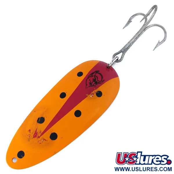 Mit einem beachtlichen Gewicht von 58 g (2 oz) gehört dieser schwere Blinker zur legendären 700er-Serie, was durch die deutlichen Stempelungen auf der vernickelten Rückseite bestätigt wird. Dieser Eppinger Dardevle Huskie Junior mit dem Produktcode 10729 misst 11,5 cm (4 1/2") und besticht durch eine leuchtend orangefarbene Lackierung mit schwarzen Punkten. Die Mitte wird von dem klassischen roten Tropfenstreifen mit dem markanten schwarzen Teufelskopf-Logo dominiert, dem Symbol der in Detroit ansässigen Firma, die 1906 von Lou Eppinger gegründet wurde. Hergestellt in den USA mit proprietären Matrizen, ist der konkave Körper für Würfe in tiefe Gewässer konzipiert, in denen größere Raubfische lauern. Die Rückseite trägt die Prägung "700 SERIES 2 OZ EPPINGER DARDEVLE MADE IN U.S.A.", was die lange Geschichte der Produktion in Dearborn unterstreicht. Dieses Exemplar wird im Zustand mit 4/5 bewertet und weist leichte Gebrauchsspuren an der Oberfläche sowie minimale Lackabplatzungen auf der Vorderseite auf, während die Vernickelung glänzend bleibt. Der große, silberfarbene Drillingshaken zeigt leichte Altersspuren, ist aber strukturell einwandfrei.
