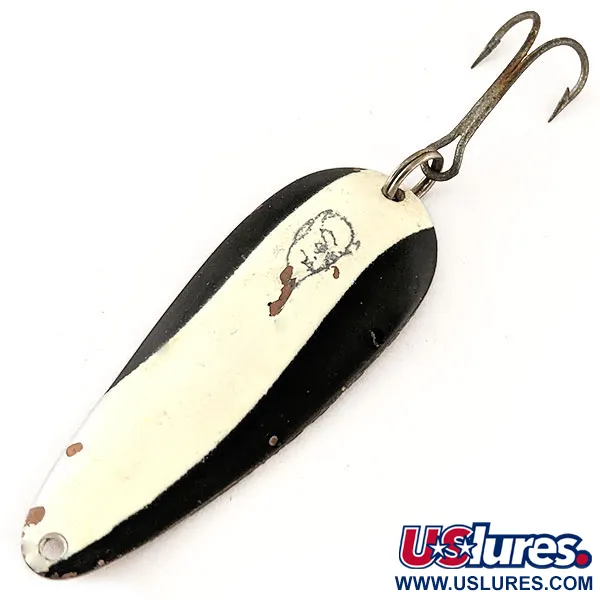 Das in den warmen Kupferrücken geprägte Logo 'DARDEVLE IMP U.S.A.' kennzeichnet diesen 5,5 cm (2 1/4") langen Blinker als echtes Stück Angelgeschichte aus Michigan. Mit einem Gewicht von 11 g (2/5 oz) verfügt der Metallkörper über ein kontrastreiches vertikales Streifenmuster in Schwarz und Weiß, eine vielseitige Farbkombination für unterschiedliche Sichtverhältnisse im Wasser. Dieses spezifische Exemplar mit der Artikelnummer 12451 weist einen Zustand von 4/5 auf, mit leichtem Lackverlust an den Kanten und der Vorderseite, der das Kupfersubstrat freilegt, ohne die zentrale Teufelskopf-Grafik zu beeinträchtigen. Das charakteristische konkave Design von Eppinger verleiht dem Blinker bei gleichmäßigem Einholen seine typische Taumelbewegung – ein technisches Konstruktionsmerkmal, das seit Lou Eppinger diese Köder in Handarbeit in seinem Keller herstellte, unverändert geblieben ist. Die Hardware ist nach wie vor robust, mit einem klassischen Drillingshaken, der durch einen stabilen Sprengring gesichert ist und sich sowohl für Wurf- als auch für Schleppangeln eignet.