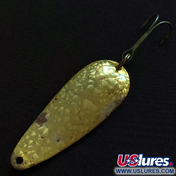 Dieser 5,5 cm lange Blinker reflektiert das Licht durch seine strukturierte, schuppenartige Oberfläche und zeigt das markante Eppinger „Crystal“-Finish, das bei Sammlern für seinen besonderen Glanz geschätzt wird. Der Metallkörper wiegt 11 g und ist auf der konkaven Seite deutlich mit der Prägung „DARDEVLE IMP“ sowie dem Produktcode 20779 versehen. Die Ausstattung umfasst einen stabilen Drillingshaken, der an einem kräftigen Sprengring befestigt ist, sowie eine saubere Schnuröse am verjüngten Kopfende. Die Bewertung dieses Exemplars ergibt einen Zustand von 4/5, wobei leichte Oberflächenspuren auf dem gehämmerten Finish sichtbar sind, die zwar das Alter zeigen, ihn aber zu einem soliden Sammlerstück für jede Vintage-Vitrine machen. Die robuste, US-amerikanische Bauweise bewahrt das klassische Tropfenprofil, das sowohl für das Wurfangeln als auch für das Schleppen konzipiert wurde.