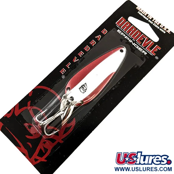 Mit einem Gewicht von 11 g (2/5 oz) verfügt dieser Köder über einen 5,5 cm (2 1/4") langen Körper im legendären rot-weiß gestreiften Muster. Dieser Dardevle Imp Klicker, Artikelnummer 13016, ist eine spezialisierte Version des klassischen Eppinger-Designs, die zwei Klicker-Blättchen am hinteren Sprengring integriert. Diese metallischen Klicker sind so konzipiert, dass sie den Blinker-Körper und sich gegenseitig berühren, wodurch die optische Lockwirkung der polierten, vernickelten Rückseite um eine mechanische Geräuschkomponente ergänzt wird. Auf der Vorderseite ist das bekannte Eppinger Teufelskopf-Logo eingeprägt – ein Qualitätsmerkmal des Unternehmens, das diese Köder seit über einem Jahrhundert in den USA herstellt. Dieser spezielle Köder ist unbenutzt, befindet sich im Zustand 6 und wird in der originalen schwarz-roten Blisterverpackung geliefert. Das Nickel-Finish auf der Rückseite ist für den Einsatz in klarem Wasser gedacht, wo eine hohe Lichtreflexion gewünscht ist. Die Montage umfasst einen stabilen Drilling, der über einen robusten Sprengring befestigt ist, ideal für die Jagd auf Barsch, Lachs oder Forelle.