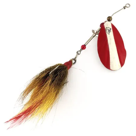 Die rot-weiße Streifung auf dem ovalen Blatt kennzeichnet diesen Dardevle JT Buel als einen Klassiker der Marke Eppinger. Mit einem Gewicht von 15 g (1/2 oz) und einer Länge von 12 cm (4 3/4") verfügt dieser Köder mit der Artikelnummer 12232 über einen befederten Trailer, der Erdtöne mit einem roten Aufblitzen kombiniert. Rote Perlen sind auf der Drahtachse aufgereiht, dienen als Abstandshalter für den Clevis und setzen einen dezenten optischen Akzent. Auf der Rückseite des Blattes bleibt das silberne Finish glänzend und zeigt deutlich die eingestempelten Herstellerdetails sowie das berühmte Teufelskopf-Logo. Dieses Exemplar befindet sich in einem außergewöhnlichen Zustand, was eine 5/5-Bewertung rechtfertigt. Die Federn am Schwanz sind voll und sicher mit rotem Garn gebunden, um während des Einholens Volumen und Profil zu erzeugen. Die Fertigung spiegelt die Qualität amerikanischer Angelgeräte aus der Mitte des Jahrhunderts wider, mit einer robusten Drahtachse und einer präzise gebogenen Öse zur Schnurbefestigung. Die Kombination aus dem klassischen rot-weißen Muster mit einem Spinnerblatt und einem Federhaken macht dies zu einer speziellen Variante innerhalb der Dardevle-Familie.