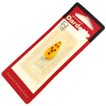 Gelber Basislack mit markanten schwarzen Rautenprägungen und dem ikonischen „Devil“-Logo prägen das Finish dieses 3,5 g (1/8 oz) schweren Blinkers. Hergestellt von Eppinger unter dem Code 7774, verfügt dieses Lil' Devle-Modell über den charakteristischen konkaven, länglichen Körper, der die Marke seit über einem Jahrhundert zu einer festen Größe in Angelkästen in Michigan gemacht hat. Der Köder ist mit einem scharfen Drilling ausgestattet, der über einen stabilen Sprengring befestigt ist, und eignet sich für verschiedene Leichtangelanwendungen im Süßwasser. Sammler werden zu schätzen wissen, dass dieses Exemplar unbenutzt ist und sich noch in der originalen rot-weißen „America's Fishing Lures“-Blisterpackung befindet. Die Rückseite der Karte spiegelt die langjährige Geschichte des Unternehmens in Dearborn, MI, wider und listet sogar das Vintage-Katalogangebot für 2,00 $ auf. Mit einer Größe von nur 3 cm (1 1/4") repräsentiert er das kleinere Ende des Dardevle-Spektrums und ist ideal für das Angeln auf Forellen oder Panfish geeignet, wo ein kompaktes Profil erforderlich ist. Das Five of Diamonds-Farbschema bleibt eines der bekanntesten Muster der Branche, hier kombiniert mit einer polierten Metallrückseite, die bei gleichmäßigem Einholen für erhebliches Aufblitzen sorgt.