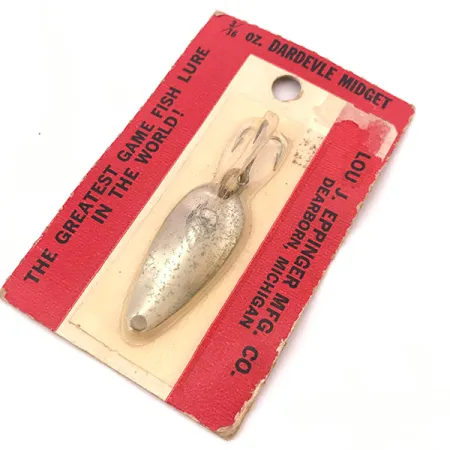 Ein poliertes Nickel-Finish zeichnet diesen 3,5 cm (1 1/2") langen Blinker aus und sorgt für eine hochreflektierende Oberfläche, die Sammler für ihre klare, klassische Ästhetik schätzen. Dieser von der Lou J. Eppinger Mfg. Co. in Dearborn, Michigan, stammende Dardevle Midget ist ein fester Bestandteil der amerikanischen Angelgeschichte, die 1959 an den Standort Dearborn umzog. Der Köder wiegt exakt 6 g (3/16 oz) und wird auf der originalen rot-weißen Verpackungskarte präsentiert, die den Produktcode 3914 trägt. Auf der Vorderseite des Blinkers ist das markengeschützte Teufelskopf-Logo eingestempelt – ein Kennzeichen der im US-Werk verwendeten Original-Prägestempel. Zur Ausstattung gehört ein scharfer Drillingshaken, der mit einem hochbelastbaren Sprengring gesichert ist, konstruiert für maximale Zuverlässigkeit beim Werfen oder Schleppangeln. Dieses Exemplar ist unbenutzt und in der Originalverpackung erhalten, die leichte Lagerspuren an der perforierten Aufhängung und den Ecken aufweist.