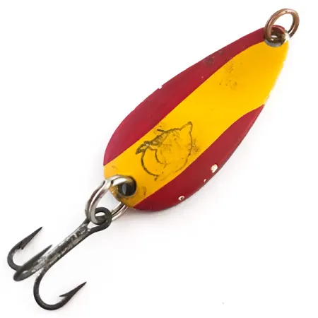 Die vernickelte Rückseite aus Metall ist mit der Prägung „DARDEVLE MIDGET U.S.A.“ versehen, was die authentische Eppinger-Herkunft dieses Köders belegt. Mit einer Länge von 1 1/2 Zoll (3,5 cm) und einem Gewicht von 3/16 oz (6 g) wird dieser kompakte Blinker unter dem Produktcode 5428 geführt. Die Vorderseite zeigt ein kräftiges diagonales Muster in Rot und Gelb, ergänzt durch das markante schwarze Teufelskopf-Logo in der Nähe der Öse. Das Design basiert auf firmeneigenen Matrizen aus Michigan, die eine spezifische konkave Form für weite Würfe oder zum Schleppen erzeugen. Die Ausstattung umfasst einen dunklen Drilling und einen robusten Sprengring am Heck. Mit einem Zustand von 5/5 bewertet, zeigt das Exemplar ein hervorragend erhaltenes Finish, wobei die rote und gelbe Lackierung ihre volle Sättigung auf dem polierten Metall behält. Dieses Dardevle-Modell vertraut auf seine längliche, konkave Form, um beim Einholen im Wasser die charakteristische taumelnde Aktion zu erzeugen.